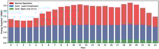 Energy Supplied by hour for the three assumed scenarios: normal operation, conventional method (Open SW1), and proposed method (Load Curtailment).
