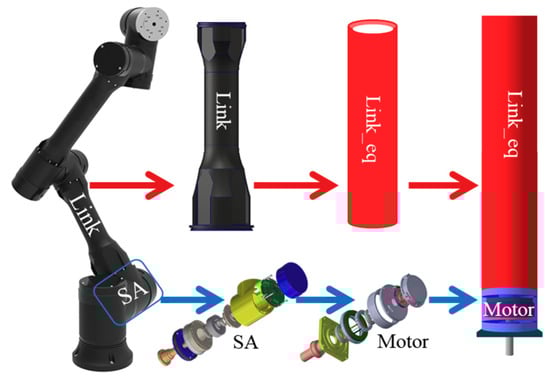 Figure 1 shows the structure of the articulated robot and its components, including links and smart actuator modules. The link is connected directly to the smart actuator module, which includes an electric motor, and also served as a cooling part for the motor. To investigate the effect of the robot link on the motor temperature, an equivalent link (Link_eq) of the same length and thickness as the original robot link was used for analysis and testing. Simplified equivalent links are easy to produce for test as well as thermal analysis modeling.