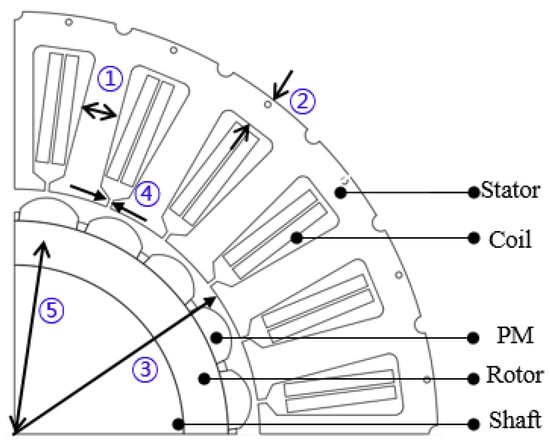 PMSM with 20-pole and 24-slot concentrated winding was adopted to use in smart actuator modules. As shown in Figure 2, some design variables including (1) tooth thickness, (2) stator yoke thickness, (3) stator inner diameter, (4) slot opening width, and (5) permanent magnet offset, which is the distance between the center of the motor and the center of the PM arc, were chosen for optimum design to obtain maximum efficiency and minimum cogging torque. Through the optimum design process, by using central composite design (CCD) and response surface methodology (RSM), a final model was chosen, and its main specifications are listed in Table 1. Besides, in order to maximize the power density of the motor, the segmented-stator core structure was used as it can increase the fill factor and decrease the cogging torque and torque ripple [14,20]. In terms of thermal design objective, the difference between temperature distributed on the end-winding and ambient temperature (DeltaT) should be less than 55 °C to prevent injury to humans caused by touching a hot surface when they work with articulated robots.