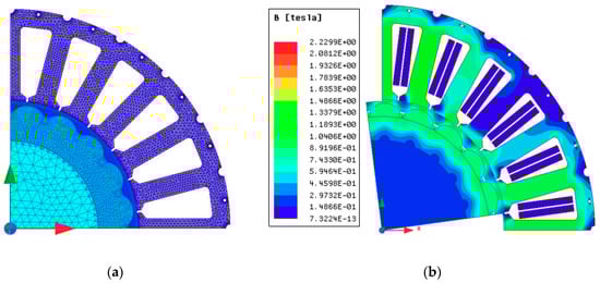 (a) Meshes of the analysis model, and (b) flux density distribution on the motor at the rated condition.