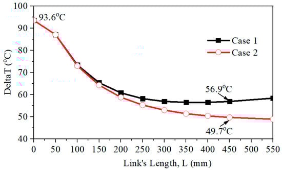The values for the heat transfer coefficient by radiation and convection of some important parts are shown in Table 3. Since the link is quite long, which is 450 mm in this study, it may cause inaccurate results in thermal analysis if we model the link as a single node. To examine the accuracy of thermal analysis results of the motor with the link, for each link’s length value, we will compare the simulation results of two cases: Case 1, modeling the link as a single node, and Case 2, dividing the link into several nodes, where each node represents a part of the link with the length of 50 mm for each part. Figure 5 illustrates the thermal analysis results of DeltaT according to the change of the length of link. When L is shorter than 200 mm, there is small difference of DeltaT between Case 1 and Case 2. As L increases, DeltaT tends to increase after it reaches the minimum point at L = 400 mm in Case 1. This occurs because the conductive resistance between the motor endcap and the link increases as the length of the link increases, while the natural convective and radiative resistances decrease as the length of the link increases. These two competing effects result in a minimum of DeltaT. In Case 2, DeltaT continuously decreases when L increases. The difference of DeltaT between Case 1 and Case 2 at 450 mm of the link’s length is about 13%. Therefore, for a long link, we should model the link as several nodes in the thermal network circuit to obtain a highly accurate result.