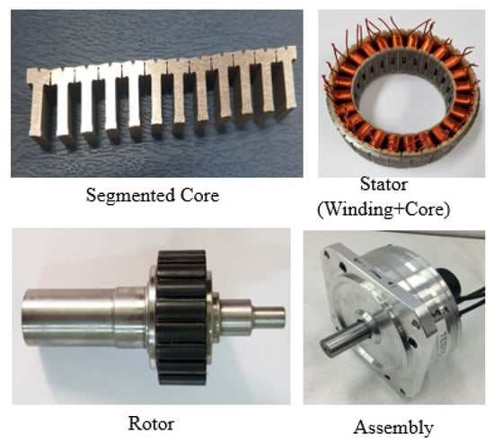 To validate the analytical results, the proposed prototype with the main specifications presented in Table 1 was made and tested, as shown in Figure 6. The segmented cores were assembled after the coil was wound so it helps to significantly increase the slot fill factor compared to the motor with solid core. The experiment was implemented at the rated condition and an ambient temperature of around 17 °C, as shown in Figure 7. Links with equal lengths and thicknesses were used in the experiments instead of the original links to easily review the temperature effects of changes in link length.