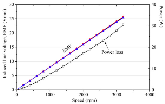 Figure 8 shows the test results at the no-load condition of 3200 rpm. The measured value of the line-induced voltage (EMF) was 25.53 Vrms. The corresponding simulated back-EMF was 26.81 Vrms, showing under 5% difference with the measured data. The power loss at the no-load condition obtained from the experiment will be used for the heat sources in thermal analysis.