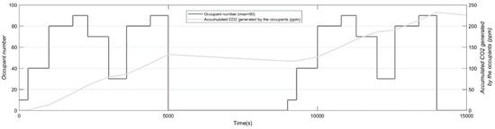 An indoor CO2 concentration scenario generated by the occupants was used as the human disturbance as well as a forecast input for the MPC and GPC. As illustrated in Figure 2, the generated CO2 concentration (ppm) was estimated according to the occupants’ number using the transfer function presented in [46]. The occupied building for our case study was considered a university lecture room with a maximum occupation of 100 students. The estimated occupancy count of the lecture room was drawn from our real-life knowledge of the building usage during the time period 15,000 s, which was composed of three periods: a 1 h 40 min lecture, 1 h 10 min break, and then another 1 h 40 min lecture.
