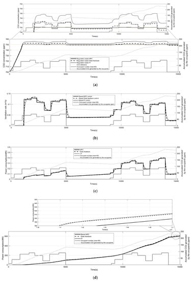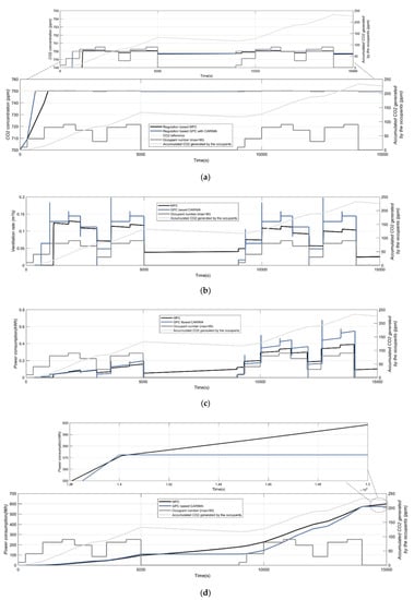 GPC based on CARIMA vs. the MPC: (a) the CO2 regulation, (b) the ventilation air flow rate, (c) the instantaneous power consumption, and (d) the accumulated power consumption.
