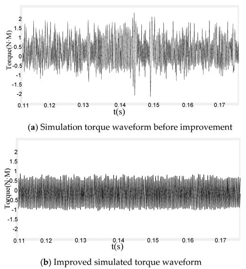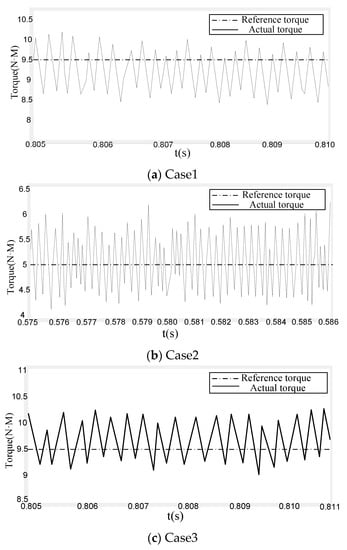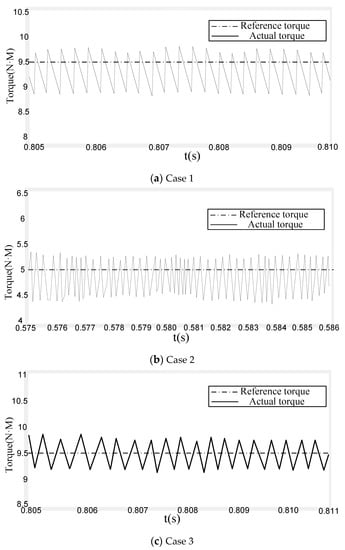 - For the case shown in Figure 6a, portion above the torque command value to the maximum torque ripple value will decrease, while the portion below the command value will not change. However, in this case, the increase in torque is much slower than the decrease in torque. Hence, the reduction is limited, and the phenomenon of negative offset of average torque still exists.