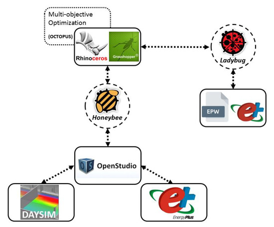 The Lady-bug plug-in allows importing in Grasshopper the weather files of Energy Plus, providing the possibility to analyze the sun path, the distribution of wind speed and direction (wind rose), the solar radiation and shadows. The Honey-Bee plug-in allows the Grasshopper to interface with Open Studio [30]. This is a platform that provides the possibility to simulate the building energy demand using Energy Plus and perform daylight analysis using DaySim [31]. The multi-objective analysis is performed using Octopus [32], a Grasshopper plug-in that extends the functionalities of the Galapagos for genetic algorithm optimization. A schematic diagram of the tools used to carry out the multi-objective optimization is provided in Figure 1.