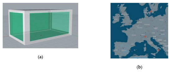 A simplified geometry has been selected for the single zone building. The shape is rectangular, 10 × 6 m with a height of 4 m, as schematically represented in Figure 2a. The building was located in the areas shown in Figure 2b. In order to compare the results obtained for the different sites, the same building orientation has been considered: North–South for the largest surfaces and East–West for the smallest surfaces.