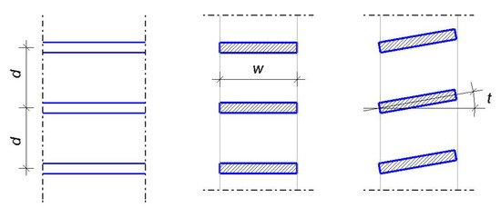 Geometrical parameters of the blades: distance between two consecutive slats—d, depth—w and inclination of the slats—t.
