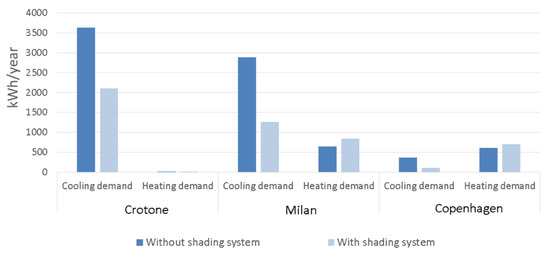 Energy demands for air-conditioning detected among the considered localities, assuming the optimized envelope configurations with and without external shading devices.