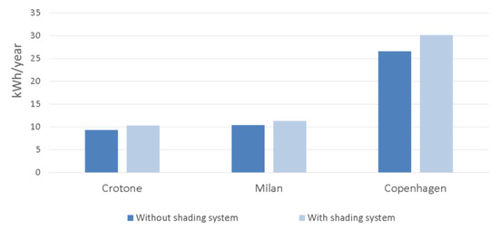 Assuming that the shading surface is covered by PV panels, the annual electricity production can be obtained. It is equal to 4851.7 kWh and it is enough to cover the energy needs for heating, cooling and the artificial lighting consumption considering the use of an electric heat pump with a mean performance index of 3 (about 700 kWhe).