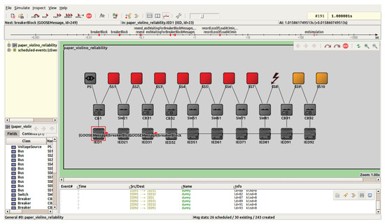 In the simulator, each switching device is connected to an IED provided with protection or fault passage indicator functionalities, from which it receives messages, such as opening or closing orders, and to which it sends information such as the open or close status, the success or failure of switching operations, and the presence or absence of a normal voltage or fault current. Separate modules to model measuring and control devices have not been developed for the sake of simplicity, although they can be included. IED modules must be programmed to execute the logic that constitutes the actual fault location and isolation system. Communication between IEDs is defined in the simulator using OMNeT++ in and out gates.