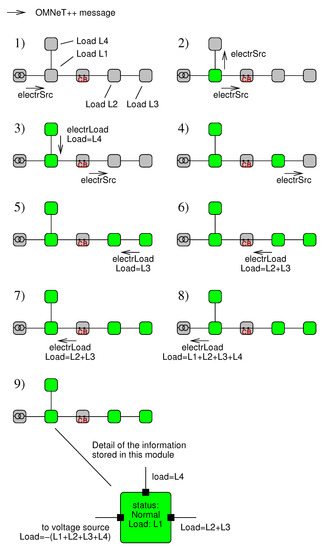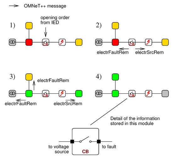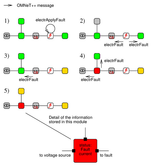 The simulation of the status of the electrical network in the proposed library relies on the exchange of messages between electrical modules to actualize the status of the distribution network. OMNeT++ is an event-based simulation program. The approach adopted to simulate the electric network is based on the principle that any event in the electrical network, such as a short circuit or the opening or closing of a switching device, triggers the sending of an OMNeT++ message from the affected module to all its connected electrical modules. When a component of the circuit receives the message, it actualizes its own status and resends the message until the message reaches either the end of the line or an open switching device. During this process, the simulation time does not advance so that changes in the status of the electrical components are perceived as instantaneous in the simulation. It must be noted that the OMNeT++ messages used to simulate the electrical network are completely unrelated to the GOOSE messages used by the decentralized protection system.