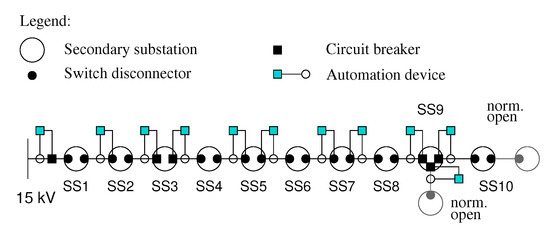 Secondary substations, identified as SS1 through SS10, are connected to the upstream and downstream sections of the line by means of two switching devices. Some of these switching devices are circuit breakers that can be used to interrupt fault currents. The rest are disconnectors that can only be opened when there is no effective current across them. Circuit breakers are installed at the primary substation at the head of the line and at substations SS3 and SS9.