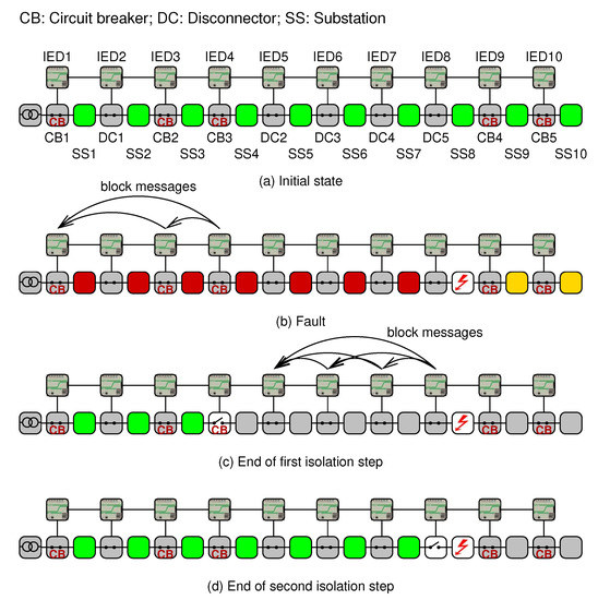 Figure 6 shows an example of the response of the protection system to a fault at Substation SS8. IEDs IED1, IED3 and IED4 participate in the first step. When the fault is detected, IED3 receives a block message from IED4, and IED1 receives block messages from IED3 and IED4. If CB3 opens successfully, the end of the first step is as shown in Figure 6c). If CB3 failed to open, the fault would be cleared by CB2 and, eventually, by CB1. A detailed description of the implementation of this system, including the mapping of the protection functions to the IEC 61850 data model, can be found in References [21,22].