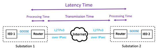 GOOSE messages are OSI model (ISO/IEC7498-1) Layer 2 messages, originally defined for substation local communications. Thus, additional mechanisms are needed to secure and exchange GOOSE messages between substations over IP. In this work, Layer 2 Tunneling Protocol Version 3 (L2TPv3) over IPsec, as proposed in Reference [23], is used for tunneling and securing GOOSE communications over the Internet. These mechanisms impose both additional communication headers and processing times.