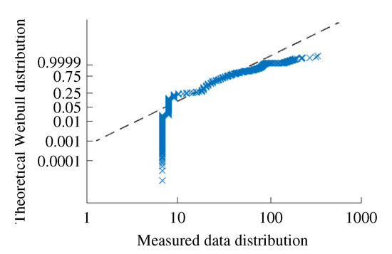 Figure 8 represents the distribution of the latency times obtained during an experiment in the laboratory. A total of 79558 packets were sent, of which 644 were lost and 14 had latency times larger than 300 ms. The figure also includes the best fit Normal, Weibull and Lognormal distributions. These results can be used later in the OMNeT++ simulations, where latency times can be modeled using the original histogram or a standard continuous probability distribution. Figure 9, for example, shows the probability plot corresponding to the best-fit Weibull distribution, which has a scale parameter of 31.7 ms and a shape parameter of 1.64 ms.