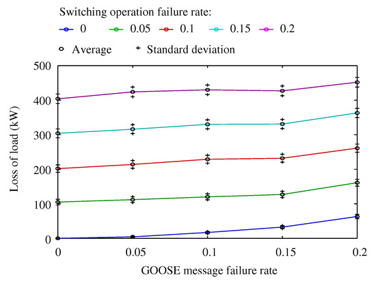 It can be seen that the failure rate of GOOSE messages has a minimal effect on the loss of load. This result is due to the retransmission of GOOSE messages and to the setting of the retransmission times to allow two retransmissions before any action is decided on by the corresponding IED. Any GOOSE message has to be lost three times, which is very unlikely, before that loss has any effect on the fault isolation procedure.
