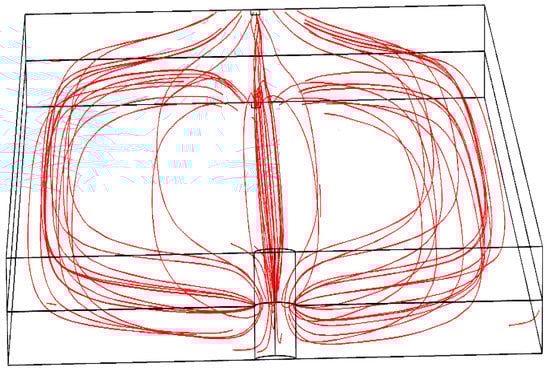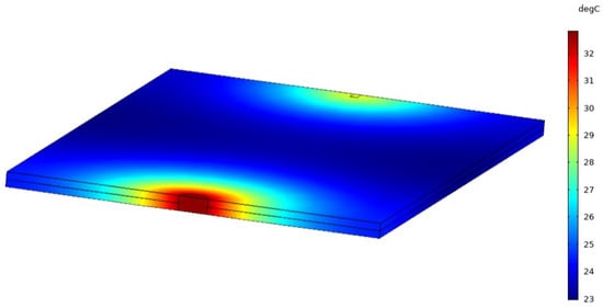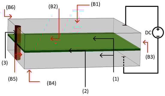 where, , , k, T, , , , and , are the mass density, specific heat capacity, thermal conductivity, temperature, the initial temperature of the sample, convective heat coefficient, the surface normal to the surrounding, and heat flux of the material respectively. Hence, to solve the heat Equation (2) the boundary condition and initial conditions of the model sample must be specified. Convective heat flux defined by (4) is assigned to all open boundaries (B1–B6), as shown in Figure 3. The coupled model is simulated using a 1 mm fault size and known material properties for 10 s. The temperature distribution of the simulated model is shown in Figure 5.