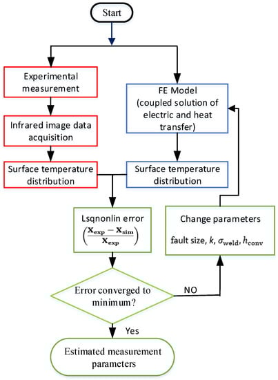 The target of the inverse problem is to predict the size of the fault region and also to determine the material properties such as convective heat coefficient, thermal conductivity and electric conductivity of the faulty region, which are essential for accurate estimation of the localized loss through temperature measurements. The methodology used in this research is presented in the model algorithm flowchart in Figure 6. The model takes as an input the average surface temperature rise on the fault area and the measured voltage from the forward FE model and experimental sample. Using the least square non-linear approximation method, the error between the measured and simulated inputs is minimized iteratively over time until the best fit parameters for the fault region are obtained.