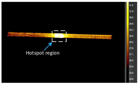 The voltage drop over the sample is measured using a voltmeter and the surface temperature distribution on the fault region is obtained with an infrared camera. The thermal image of the measured sample surface at 8 s after power was switched on is shown in Figure 7. From the image, it was observed that current streaming through the fault region creates high loss density, which results in the formation of a hotspot around the short circuit. Since we are interested in the hotspot region (area enclosed in the white dash box), the rise in temperature of the fault region is obtained and used in the inverse algorithm.