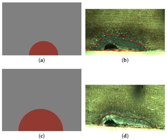 Comparing predicted fault with experimental sample. (a) Model sample with 2.2 mm fault width. (b) Measured sample with 2.06 mm fault width. (c) Model sample with 3.0 mm fault width. (d) Measured sample with 2.82 mm fault width.
