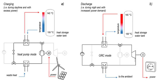 System setup for the reversible HP / ORC storage system during: (a) charging and (b) discharging [3].