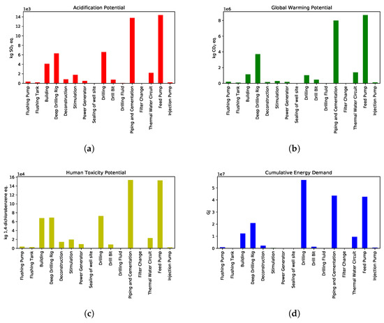 LCA results of a geothermal station for: (a) AP; (b) GWP; (c) HTP and (d) CED.