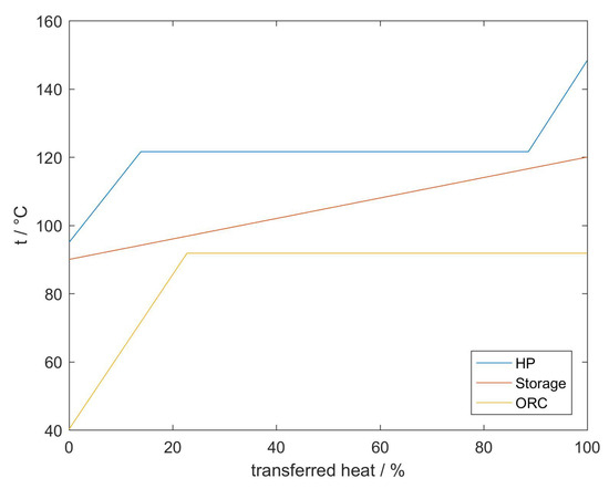 t-Q-diagram for the heat storage heat exchanger for HP and ORC.