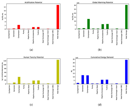The results of the LCA are shown in Figure 6. It can be clearly seen that the heat storage system has by far the greatest impact on the environment. The mass of steel to be melted, water to be purified and insulation to be produced exceeds the impact of all other plant components by far. In second place is the compressor, which is twice as large as the turbine of the plant. Throttle, valves and other accessories in the piping show that they also make up a proportion not to be underestimated compared to the working machines. Since the P2P efficiency is specified as 50%, the choice of the working fluid does not enter in the LCA as a function of operating parameters, but in those of the construction of the plant. The energy required for the production of cyclopentane was calculated based on [43]. For the calculation of the GWP, an equivalent of 11 kg carbon dioxide per 1 kg of cyclopentane was included in the calculations.