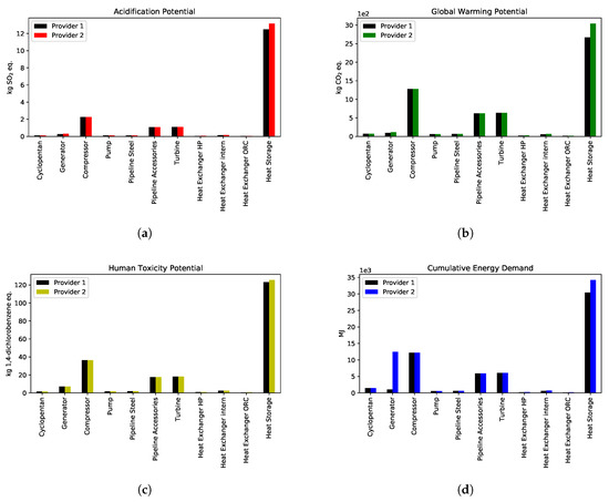 Many results depend on the provider used for steel in the software OpenLCA. A provider contains necessary data of a material to calculate the environmental impact of a process. With another provider available for steel in the free databases used, a sensitivity analysis is recommended. The results of both providers are displayed in Figure 7 and show that there are hardly any differences across the storage components between the two providers. Only for the heat storage unit itself are small differences visible. As the differences between the providers are unknown, the more pessimistic provider 2 was used for the calculations due to the many simplifications already made.