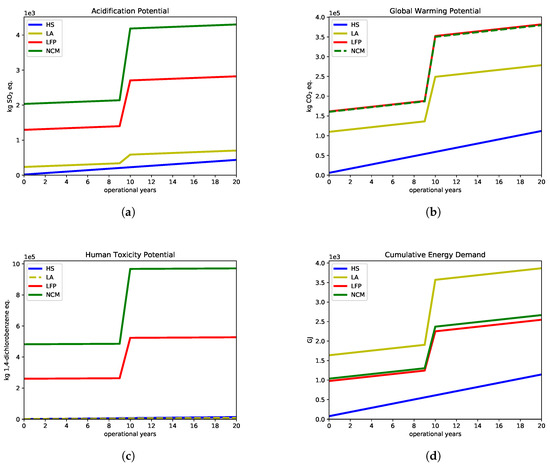 For the three battery systems all displayed results are literature values. They refer to a functional unit of 1 kWh electricity output and were scaled linearly to 1 MWh for a better comparison. Since the literature values also contain no or hardly any transport for use, similar transport routes like for the heat storage system are added. The data used are shown in Table 10 and are based for the lead acid battery on the results of [45,46,47], for LFP and NCM on [48]. In the categories considered, it can be seen that the lead-acid battery only performs worse than the lithium-ion battery in the CED.