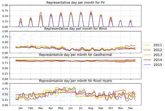 Representative day per month for PV, wind power, geothermal and river hydro in the years from 2011 to 2015.
