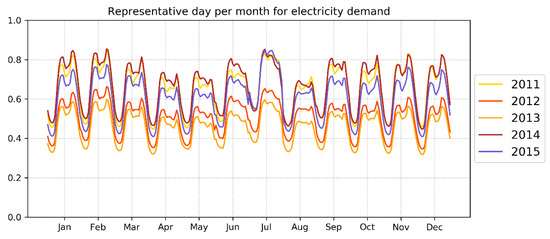 The overall electricity demand is the sum of various contributions: the generic electricity demand, electricity demand from the heating sector, electricity demand from the cooling sector and electricity demand from the mobility sector. Figure 2 shows the representative day per month of the overall electricity demand in the years from 2011 to 2015. It is possible to observe the two-peak daily profile, one in the morning and one in the evening. The highest values of electricity demand are in July when cooling requirements become more relevant. The total electricity demand in 2015 is equal to 316.9 TWh after transmission losses deduction, Terna data [55].