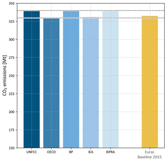 Comparison of annual CO2 emissions between the value obtained through simulation in the Baseline 2015 and those given by other different sources: UNFCCC [63], OECD [64], BP [65], IEA [62] and ISPRA [66].
