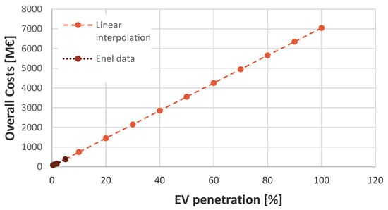 The costs related to electric mobility is considered in the model. Starting from the study of the Enel foundation [73], the cost of the electric vehicles (EV) infrastructure is estimated for different shares of penetration of battery electric vehicles (BEV). Figure 5 shows these costs which increase linearly at the increasing of the EV penetration. These costs take into account the infrastructural costs of electric mobility for urban and sub-urban areas and the costs for different type of charging stations.