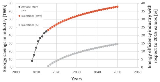 Energy efficiency in the industry sector: historical data and projections to 2050 through a logarithmic interpolation.