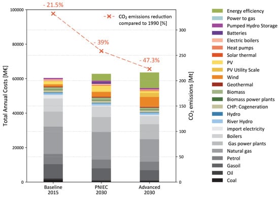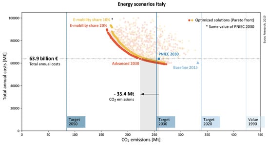 The results of the two optimization problems are depicted in Figure 7. It shows the Baseline 2015, the PNIEC 2030 and the Pareto fronts of optimal solutions for the cases with 10 and 20% electric mobility penetration. One scenario is selected on the 20% electric mobility Pareto front with the same costs of the PNIEC 2030 scenario. It is named Advanced 2030. The graph allows the following remarks: