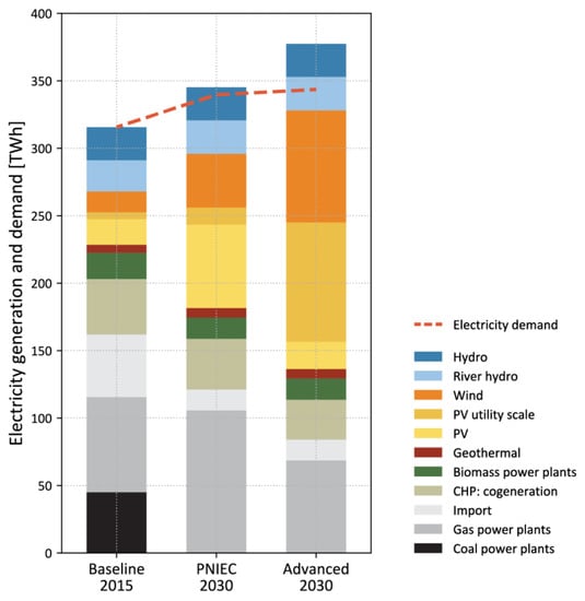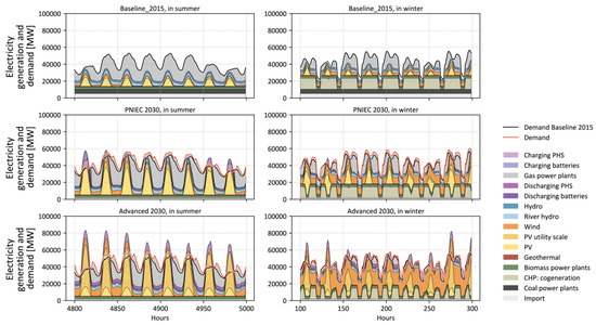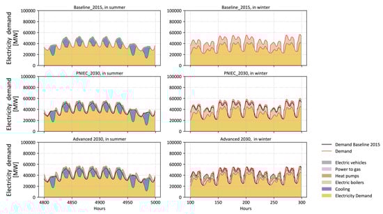 Figure 8 shows the evolution of the electricity demand in a week in summer and in winter for the three solutions: Baseline 2015, PNIEC 2030 and Advanced 2030. It is possible to observe the increase of electricity demand due to energy efficiency of buildings and the substitution of electric boilers with heat pumps and electric mobility. Power-to-gas electricity demand is equal to zero because the optimization does not choose it to decarbonize the energy system. The main reason is the limited amount of available over-generation from renewables that can be used by power-to-gas for the hydrogen generation. This over-generation can be noted in Figure 9 which shows the electricity generation from the different sources. The over-generation is present mostly in summer and partly exploited by the existing pumped hydro storage systems.