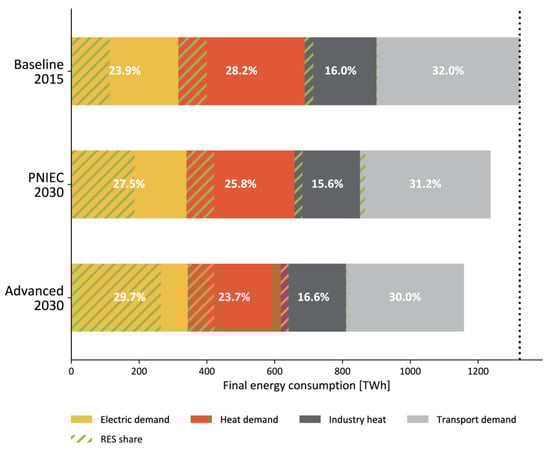 The second step is the definition of the EnergyPLAN input file for the Italian integrated energy and climate action plan [3]. All the input values are taken from the Italian integrated energy and climate action plan document. The resulting scenario is called PNIEC 2030 scenario. The major transformations regard the electricity sector in which an increase of renewable energy penetration is foreseen, mainly photovoltaics and wind power technology, capable of covering 55% of gross final electricity consumption. The same indicator for the baseline year is equal to 34%. Moreover, the PNIEC 2030 scenario implements 40 GWh of stationary batteries. It is characterized by 10% penetration of electric mobility and an increase of the consumption of advanced biomethane in the transport sector. It also foresees an increase of energy efficiency of buildings equal to 15% by 2030.