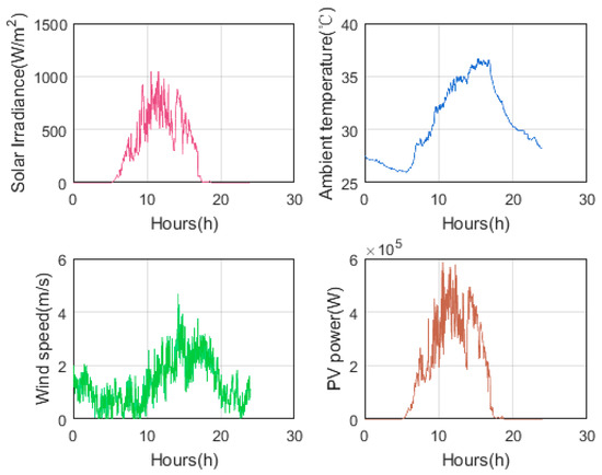 The data of the PV plants include the observations of the meteorological variables (i.e., solar irradiance, ambient temperature, and wind speed), and the output power of the PV modules. The collected data range from 24 June 2015 to 23 June 2016. All the measurements are averaged and sampled every minute. Then the one minute measurements are averaged over one hour for one-hour-ahead PV power forecasting. There is no missing point among the one-hour data. The details of raw data without preprocessing are shown in Table 1. Figure 1 shows the randomly selected data which are from 24 June 2015 00:00:00 to 24 June 2015 23:59:00 as the samples.