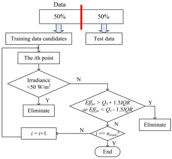 The box plot rule classifies an observation as an outlier if Effpv > Q3 + 1.5IQR or Effpv < Q1 − 1.5IQR [25]. Here, Effpv denotes the PV efficiency of the historical data. Q1 and Q3 denote the first and third quantiles of all values of Effpv. IQR denotes the interquartile range (i.e., Q3–Q1).