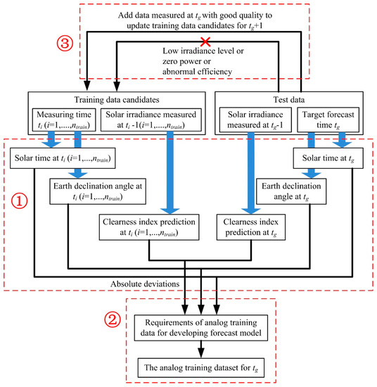 The steps of the proposed analog approach for one-hour-ahead PV power forecasting are shown in Figure 4. The analog training data for the target forecast time (tg) are chosen from the training data candidates tested at ti (i = 1, …, ntrain).