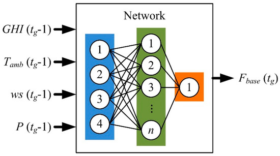 The proposed NNE framework is a systematic ensemble of the FNN predictors, as shown in Figure 5. Several common ANN models, including the FNN, the radial basis function (RBF) network, and the Elman network, are compared. The FNN is chosen as the base predictor for its good performance. The FNN has a single hidden layer and is trained using the backpropagation (BP) algorithm and genetic algorithm (GA) for better network learning. The PV power predictions at tg are denoted by Fbase(tg), which are the outputs of the base predictors; the global horizontal irradiance (GHImeas), the ambient temperature (Tamb), the wind speed (ws), and the PV power (P) measured at the prior hour before tg (denoted by GHImeas (tg − 1), Tamb (tg − 1), ws (tg − 1) and P (tg − 1), respectively) act as the inputs of the base predictors.