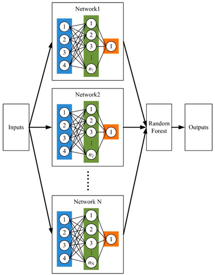 - Then an ensemble forecast framework is trained for the target forecast time using the selected training data. It does not utilize NWP models, but rather uses the artificial neural network (ANN) to act as the base predictors, which is more accurate than the NWP-based methods for the forecast horizons shorter than six hours [18]. These approaches have been known as the neural network ensemble (NNE) [22]. In this work, the random forest (RF) algorithm is then adopted to blend the forecasts of the ANNs.
