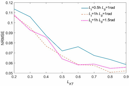 Before developing the methodology for PV power forecast, the limits of the changes of tsolar, δ, and KT are set for the proposed analog approach. The target of the analog approach is to select the training data which are tested at the similar conditions from the historical observations, while guaranteeing enough data for the development of models. To this end, the limits (i.e., Lt, Lδ, and LKT) are chosen for minimizing the NRMSE obtained by the analog plus NNE method tested on the validation data. The rough changing trend of the values of the NRMSE with the varied Lt, Lδ, and LKT is shown in Figure 7. It can be seen that the minimized NRMSE occurs at Lt of 1 h, Lδ of 1 rad, and LKT of 0.8, respectively. Accordingly, Lt, Lδ, and LKT are set to be 1 h, 1 rad, and 0.8.