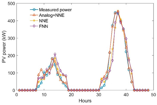 Furthermore, there is another noteworthy point in Table 2 to discuss. The analog plus NNE method produces the most accurate results during clear days. This coincides with the related results in literature (e.g., [30]). However, in Table 2, the NNE method and the single FNN method give lower NRMSE and NMAE values during the cloudy days than the clear days. As shown in Figure 10, due to the shading effects of clouds, the PV power productions on a cloudy day are approximately less than half the power generations on a clear day. This indicates that the absolute deviation between the predicted and the measured PV power (i.e., F(ti) − P(ti)) in Equations (6) and (7) on a clear day will be essentially larger than that on a cloudy day. Thus, the larger NRMSE and NMAE of the NNE and the FNN methods during the clear days are mainly caused by the larger absolute deviation between F(ti) and P(ti) compared with the cloudy days.