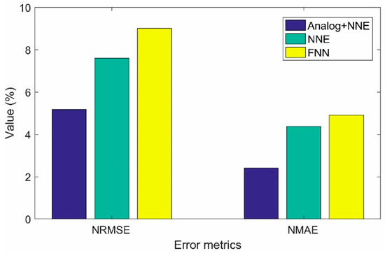 The values of the NRMSE and NMAE computed for the methods are shown in Figure 9. The proposed method combining the analog approach for one-hour-ahead forecast with the NNE provides the most accurate results. Compared to the single FNN model, the NNE approach reduces the forecast error metrics from 9.02% NRMSE and 4.92% NMAE to 7.60% NRMSE and 4.38% NMAE. This demonstrates the effectiveness of the proposed ensemble method based on the RF. The comparison between the analog + NNE and the NNE methods indicates that the proposed analog approach can reduce the error from 7.60% NRMSE and 4.38% NMAE to 5.18% NRMSE and 2.42% NMAE. This shows the importance of selecting the proper data for the model training.