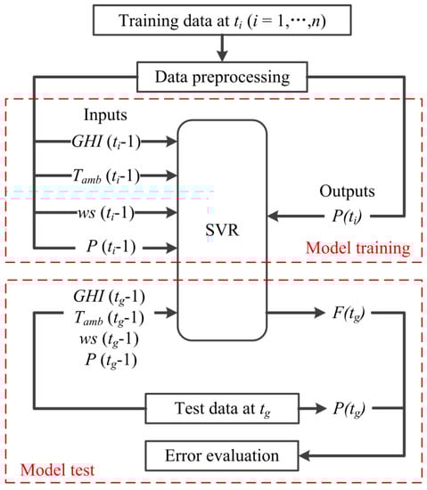 The SVR model has been widely used to predict PV power with good generalization capability [5]. The outstanding aspect of SVR is that it realizes the best trade-off between the empirical error and the model complexity [34]. SVR is able to perform an improved non-linear regression by the kernel trick and other optimization features. In this work, an RBF kernel is applied. The parameters of the SVR model are optimized by the grid-search with cross-validation. In order to make comparison with the proposed method, we use the same inputs, training data, and data preprocessing approach for the development of the SVR model. The performance of the SVR model is tested on the same test data. This procedure is shown in Figure 11.