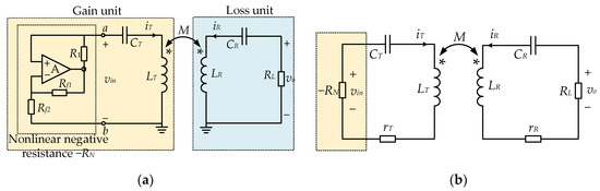 Due to the operational amplifier’s saturation voltage, both ends of ab can be equivalent to a nonlinear negative resistance −RN with a resistance value of −R1/(A−1), wherein A = 1 + Rf1/Rf2 [28]. Therefore, the equivalent circuit is shown in Figure 1b. The negative resistance −RN will input power into the LC series resonant circuit at the transmitter, and then transmit the energy to the load through the magnetic coupling between the transmitting coil and the receiving coil.